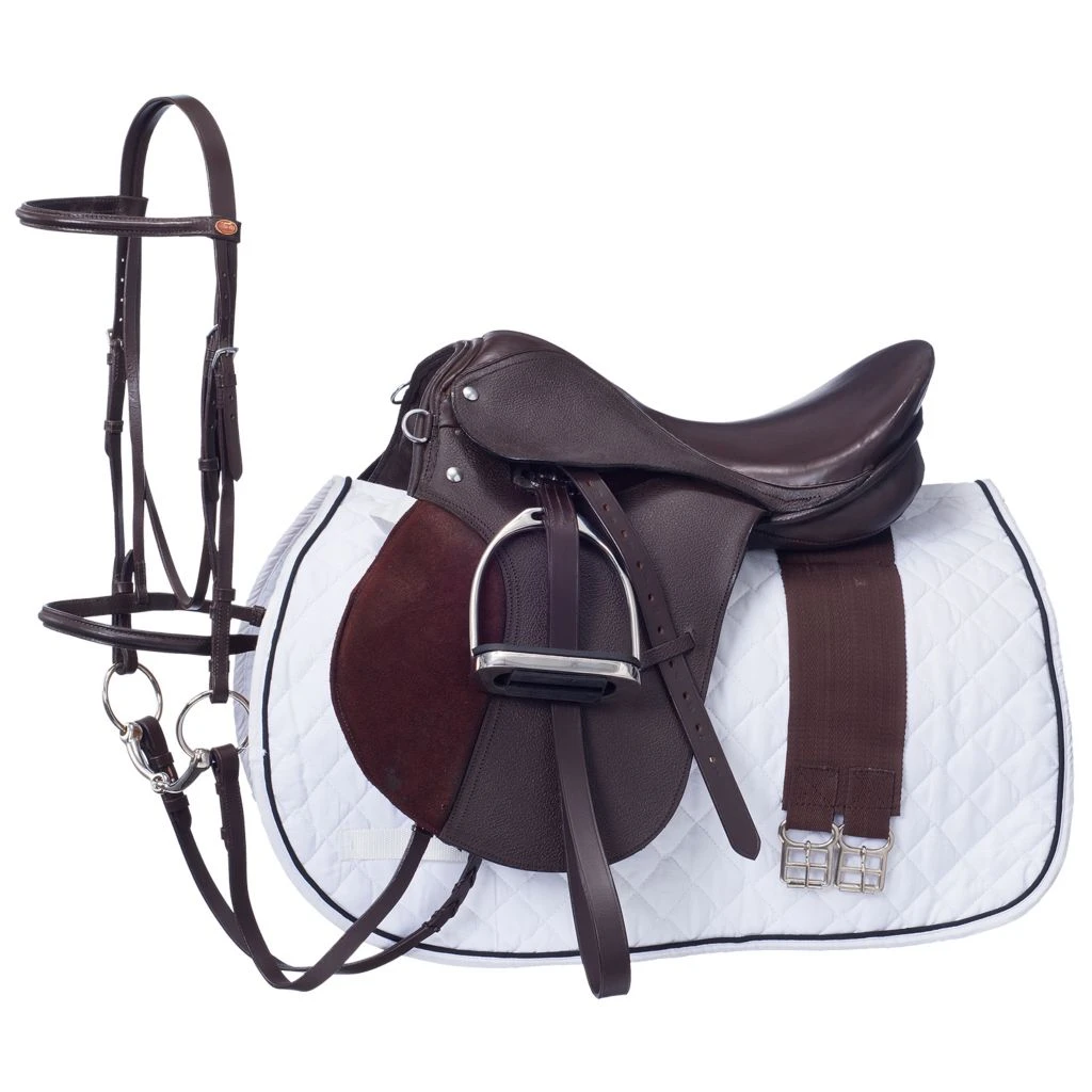 - Also includes: a leather girth, a laced rein snaffle bridle, stirrup irons with pads, stirrup leathers, and a quilted cotton saddle pad
