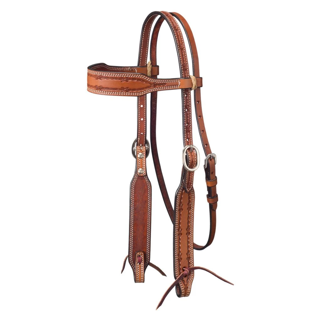 - Premium leather wide brow headstall with barbed wire tooled detail